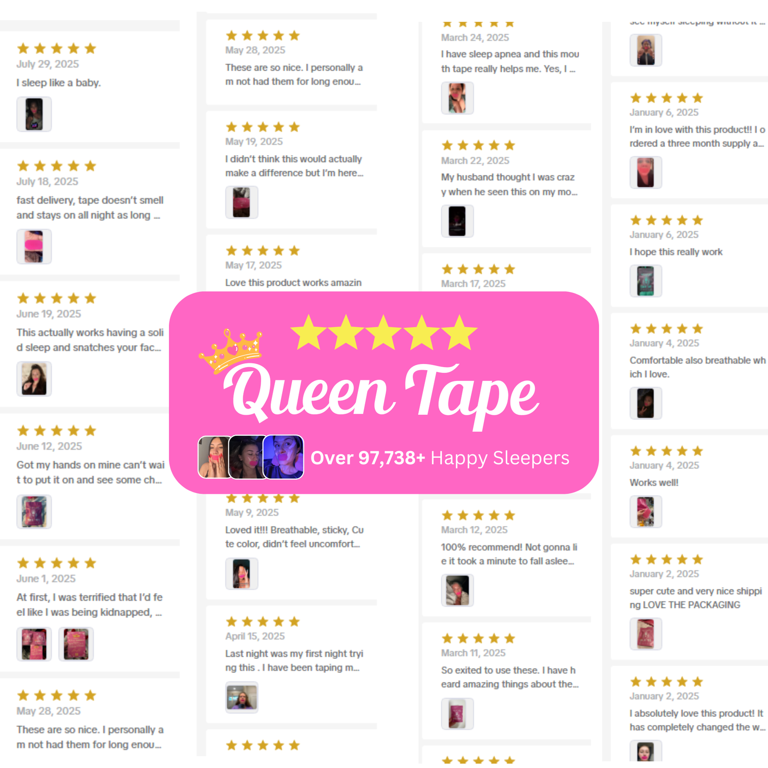 Backed by rigorous research, Queen Tape is designed to promote nasal breathing by gently sealing your lips which can help you sleep deeper and longer, stop snoring, boost energy & focus, and improve overall health & wellness.